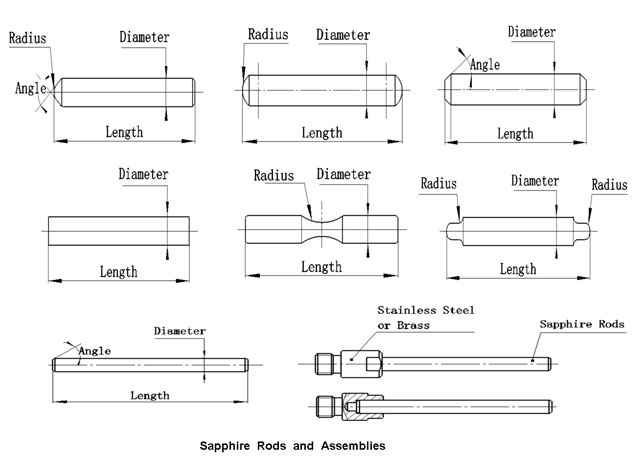 Rods are available with diameters or ends both highly polished. Rods with radius and total or partial flats and angles are available. The Czochralski ruby used in the manufacture of our laser rods is noted for its ultra-high purity - free from inclusions, clouds, bubbles, lineage or axis misorientations. Typical Applications: pumps, light pipes, spacers,insulators,sapphire piston for HPLC system.Main types: